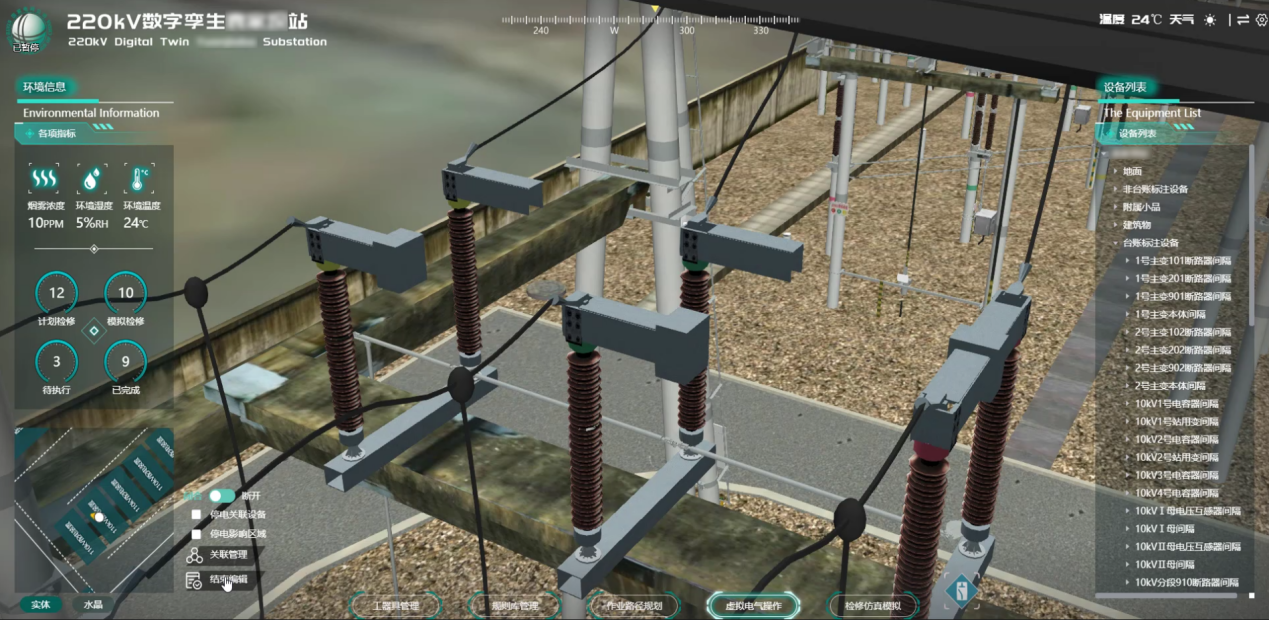 国遥新天地变电站检修作业仿真模拟平台(以下简称“平台”)通过利用数字孪生技术,对变电站设备进行三维实景重构,接入各类监测数据进行展示与统计分析,以此实现对变电站的智能监控与管理。在此基础上,开展检修作业装备智能匹配、检修路径和作业范围自动规划、变电站三维电路及虚拟电气操作、检修作业全景仿真模拟推演等业务,进而有效提升变电站在检修作业方面的数字化水平。